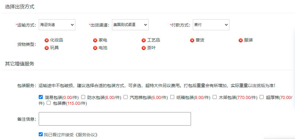 申请打包就是选择某会员哪几个快递合包成大包裹。 (1)登录前端—申请邮寄--勾选合包的订单--点击订单出库: (2)填写信息 ① 选择收货地址;② 选择出货方式,付款方式;③ 勾选包装服务、《服务协议》;点击【保存信息】:
