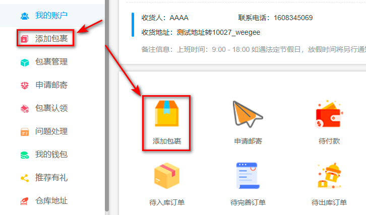登录前端,点击【添加包裹】: