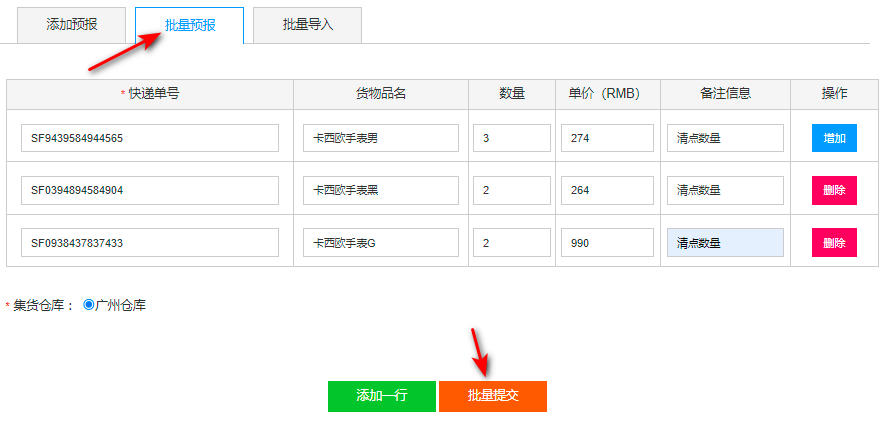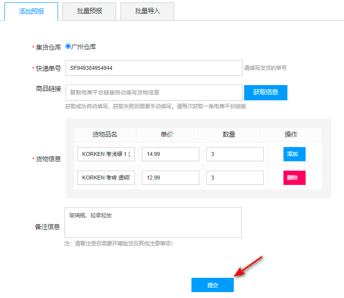 选择【批量预报】,填写多个包裹的【快递单号】、品名信息,点击【批量提交】: