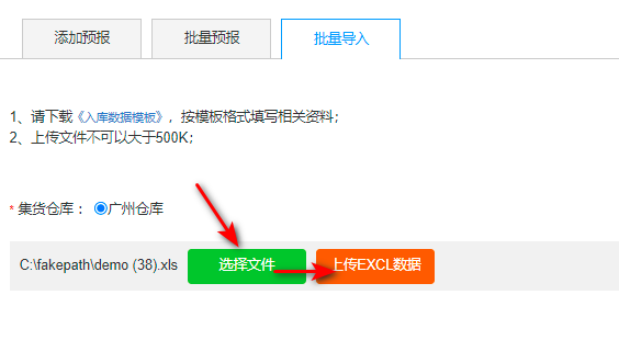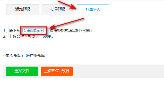 点击【批量导入】,点击蓝色字《入库数据模板》:
